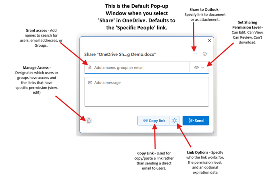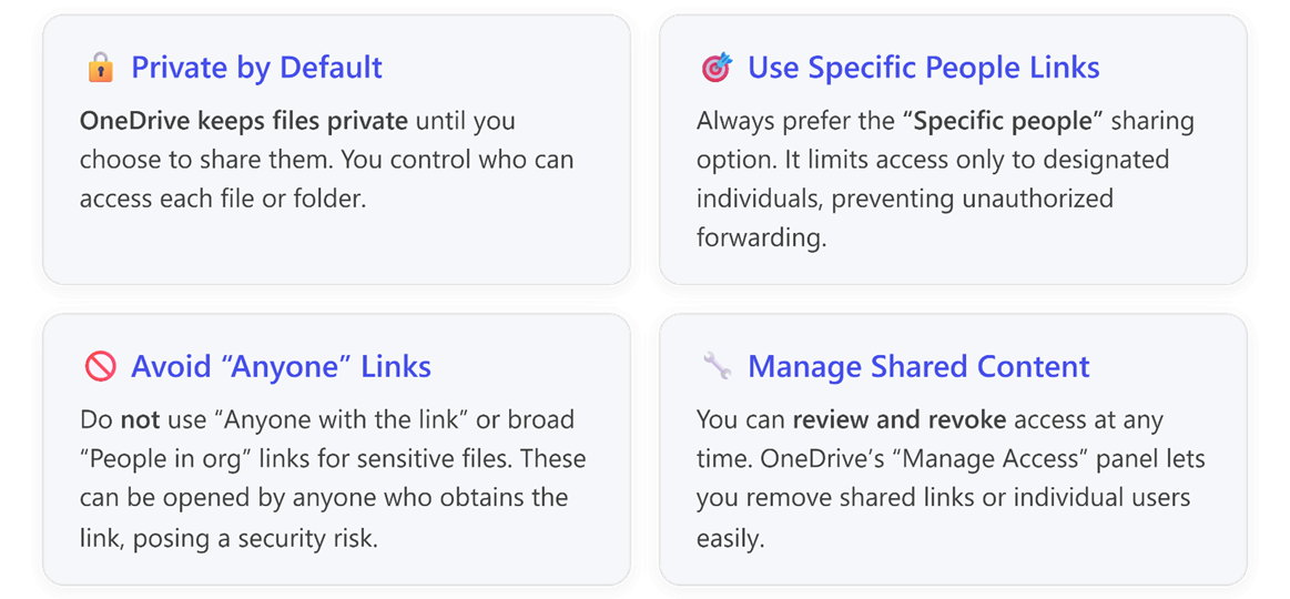 o See article for OneDrive Sharing Guidelines and Sharing Best Practices