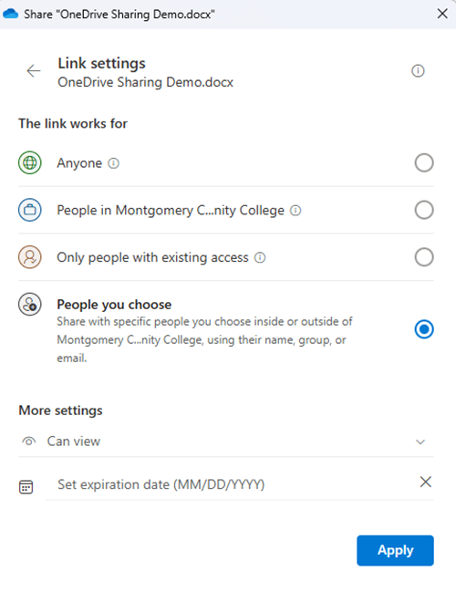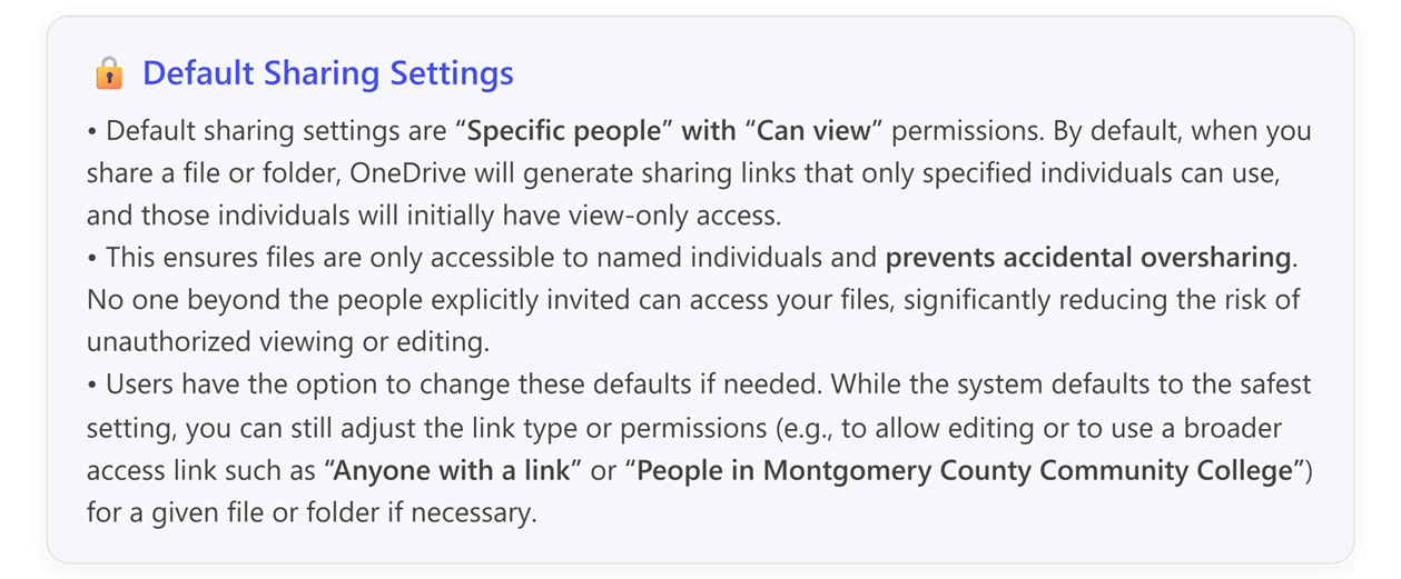 To providebest practices for sharing files and folders in OneDrive, withstep-by-step instructions when sharing via the OneDriveWeb interface, the OneDriveDesktop client, and directlyfrom within Office 365 applications(Word, Excel, PowerPoint).The guidance is tailored for Faculty, Staff, and Students, emphasizingsecure link settings(using Specific people rather than broad links such as Anyone with a link and People in Montgomery County Community College).