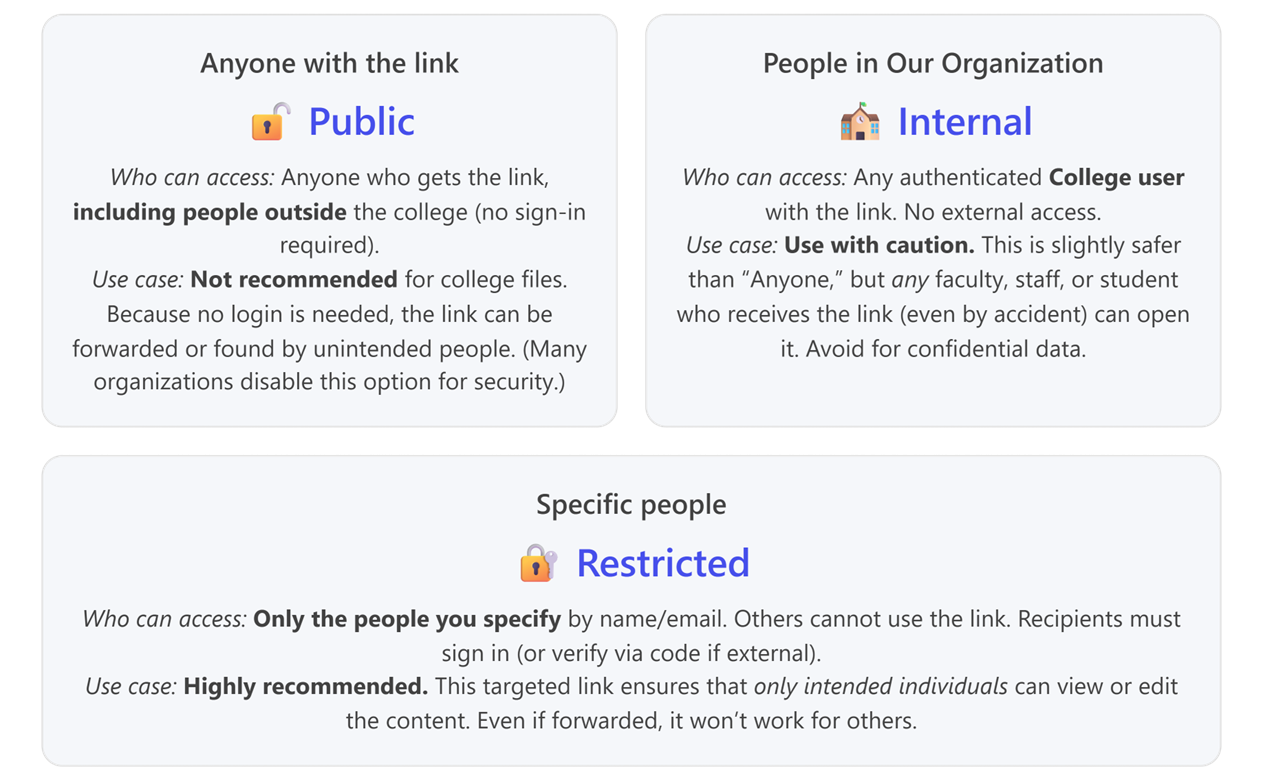 When sharing with people outside the college, always choose Specific People links and enter their email addresses.